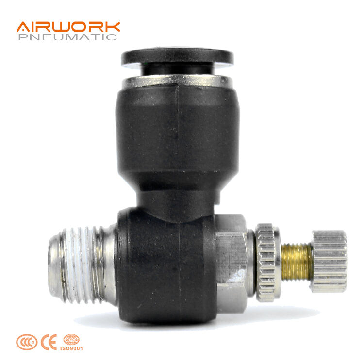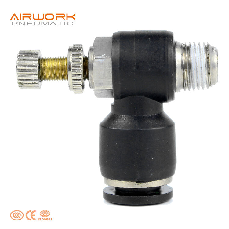 One-way flow control valves are called throttle valves amd also called speed controller which are part of the category of flow control valves. They restrict the flow of the compressed air in the flow direction. A throttle valve is used to regulate volumetric flow rates. The restrictor creates a narrowing of the line's cross-section – it is a localised flow resistance.